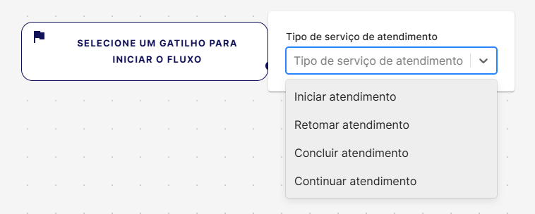 Ao iniciar a criação de um novo Fluxo, o botão de gatilho vai estar exibido no centro da tela, podendo escolher entre as opções abaixo: