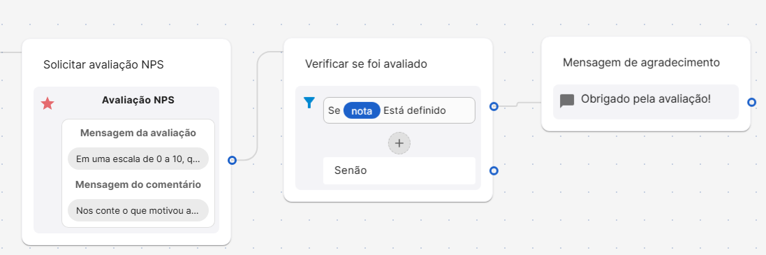 Além disso a mensagem de agradecimento não será definida nesse bloco, para isso é necessário adicionar um bloco de texto do tipo bolha, e caso tenha definido um intervalo entre as avaliações, é necessário adicionar um bloco de condição validando se há uma nota para então enviar a mensagem de agradecimento, senão irá enviar apenas a mensagem de agradecimento.