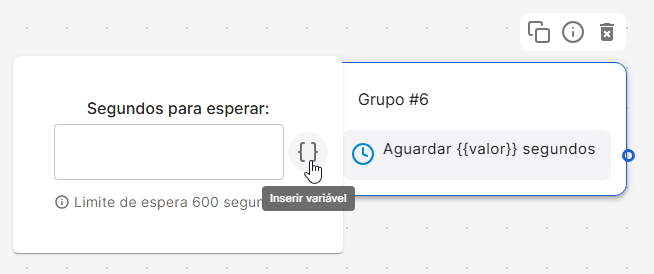 Pausa o fluxo por um período configurado antes de seguir para o próximo bloco. É útil para dar intervalo entre mensagens, aguardar processos externos ou controlar o ritmo do atendimento. É permitido adicionar uma variável, porém, se o valor da variável não for numérico ou ultrapassar o tempo limite de 10 minutos, ele será pulado.