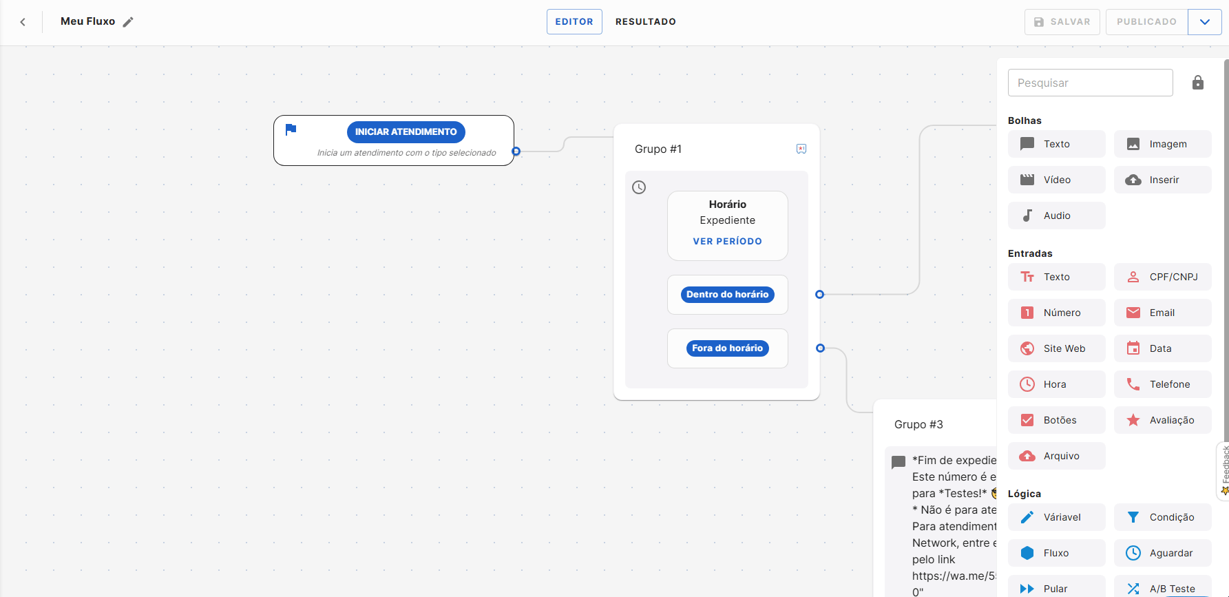 Exemplo de uso: direcionar o contato para uma mensagem automática fora do horário comercial ou encaminhá‑lo para um atendente se estiver dentro do expediente.