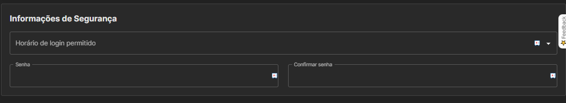 Após, em Informações de Segurança no campo "Horário de login permitido", você consegue definir um horário para que esse usuário possa acessar a plataforma (Disponível no plano Gold), e em Senha e Confirmar senha, informe a senha que o usuário utilizará para fazer o primeiro acesso!