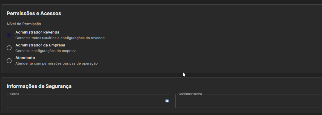 Administrador da Empresa: Maior nível de acesso para clientes. Para revendas, esse usuário só tem acesso à empresa vinculada.