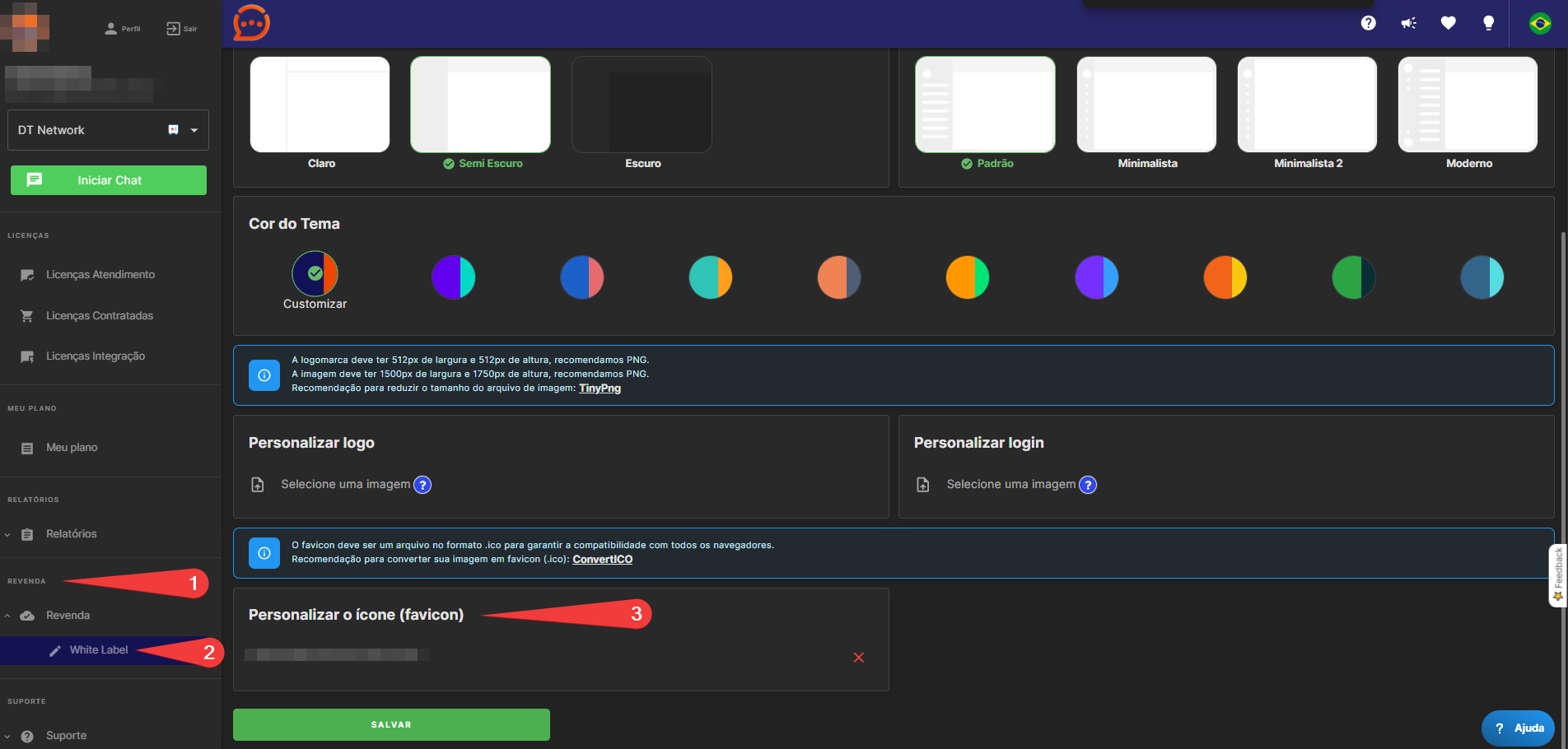 Para isso, no seu painel, vá até o menu Revendas > White Label, e selecione a aba "Cores e Temas"